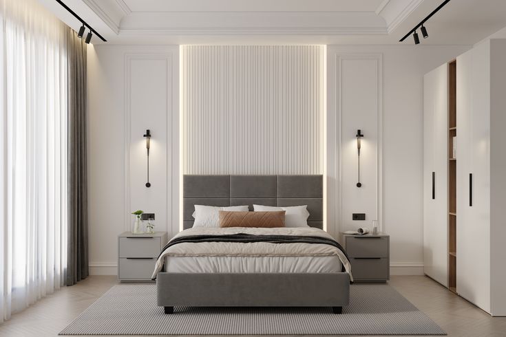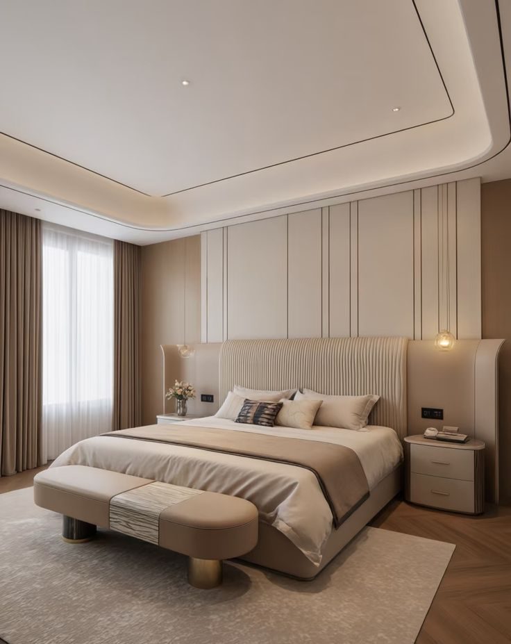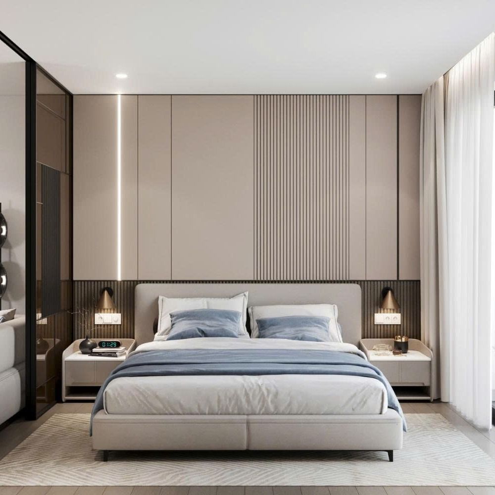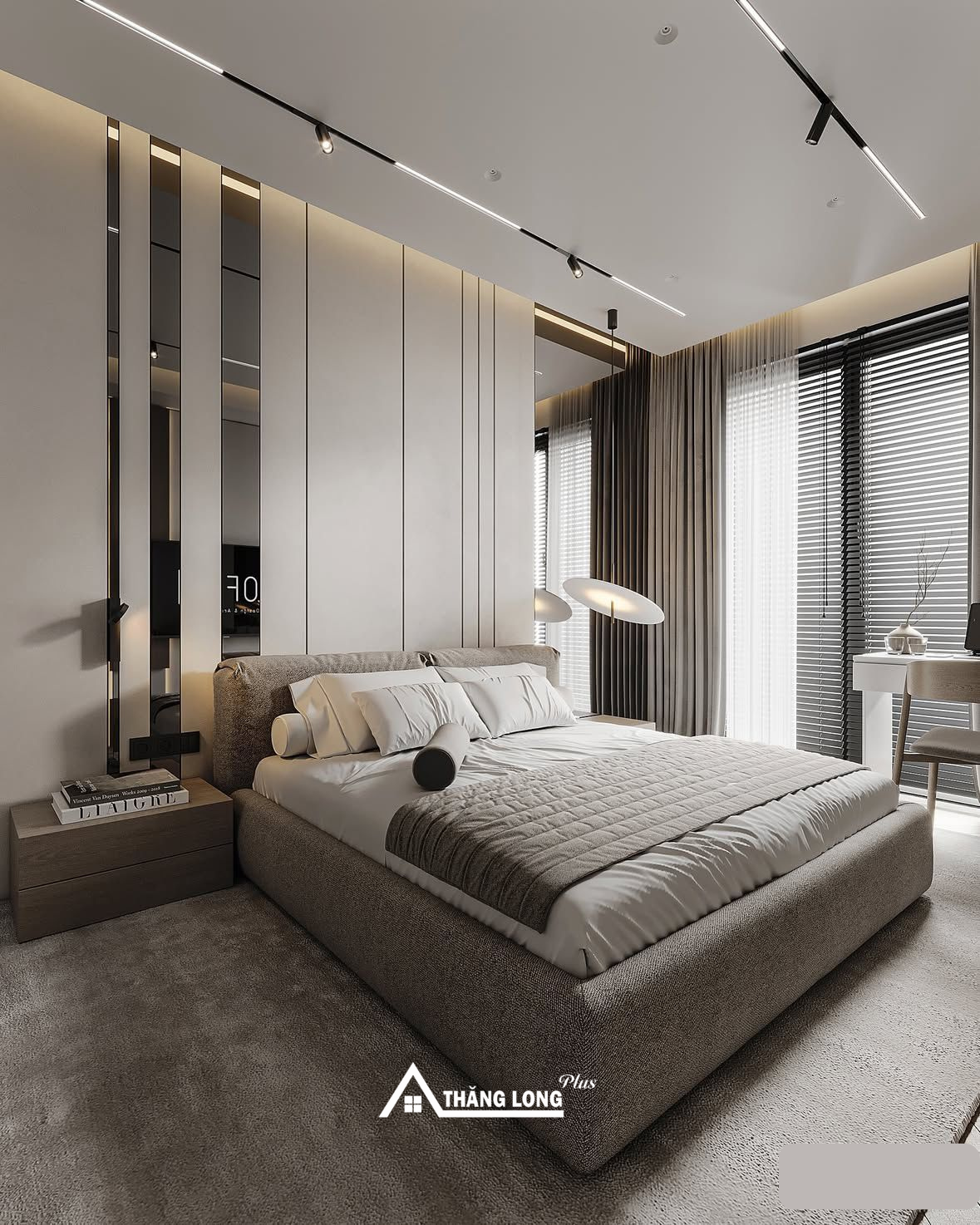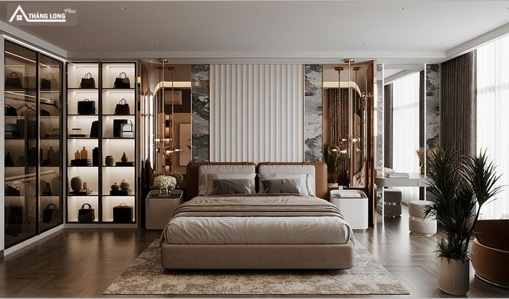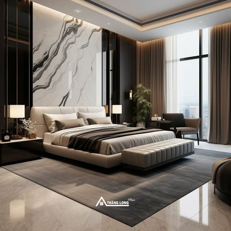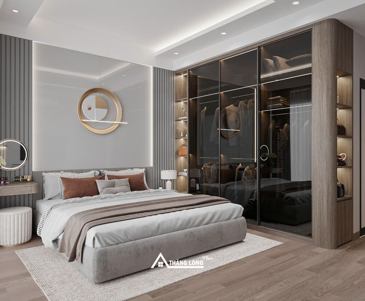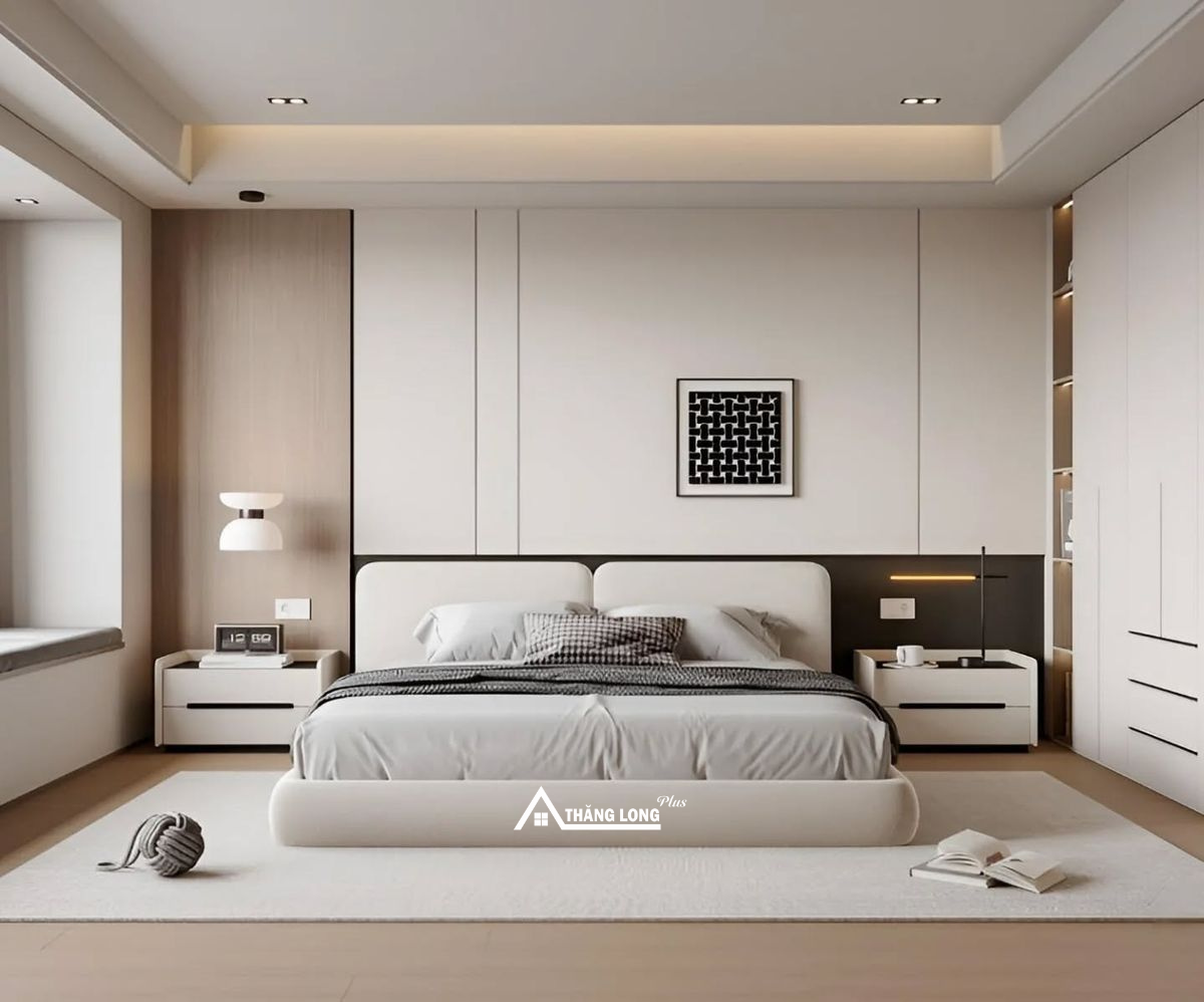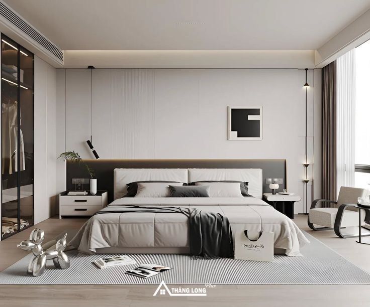 Phòng ngủ Master phong cách hiện đại mang đến sự tối giản nhưng vẫn sang trọng và đầy đủ tiện nghi. Không gian ưu tiên đường nét gọn gàng, màu sắc trung tính như trắng, xám, be kết hợp với chất liệu cao cấp như gỗ, kính, kim loại.