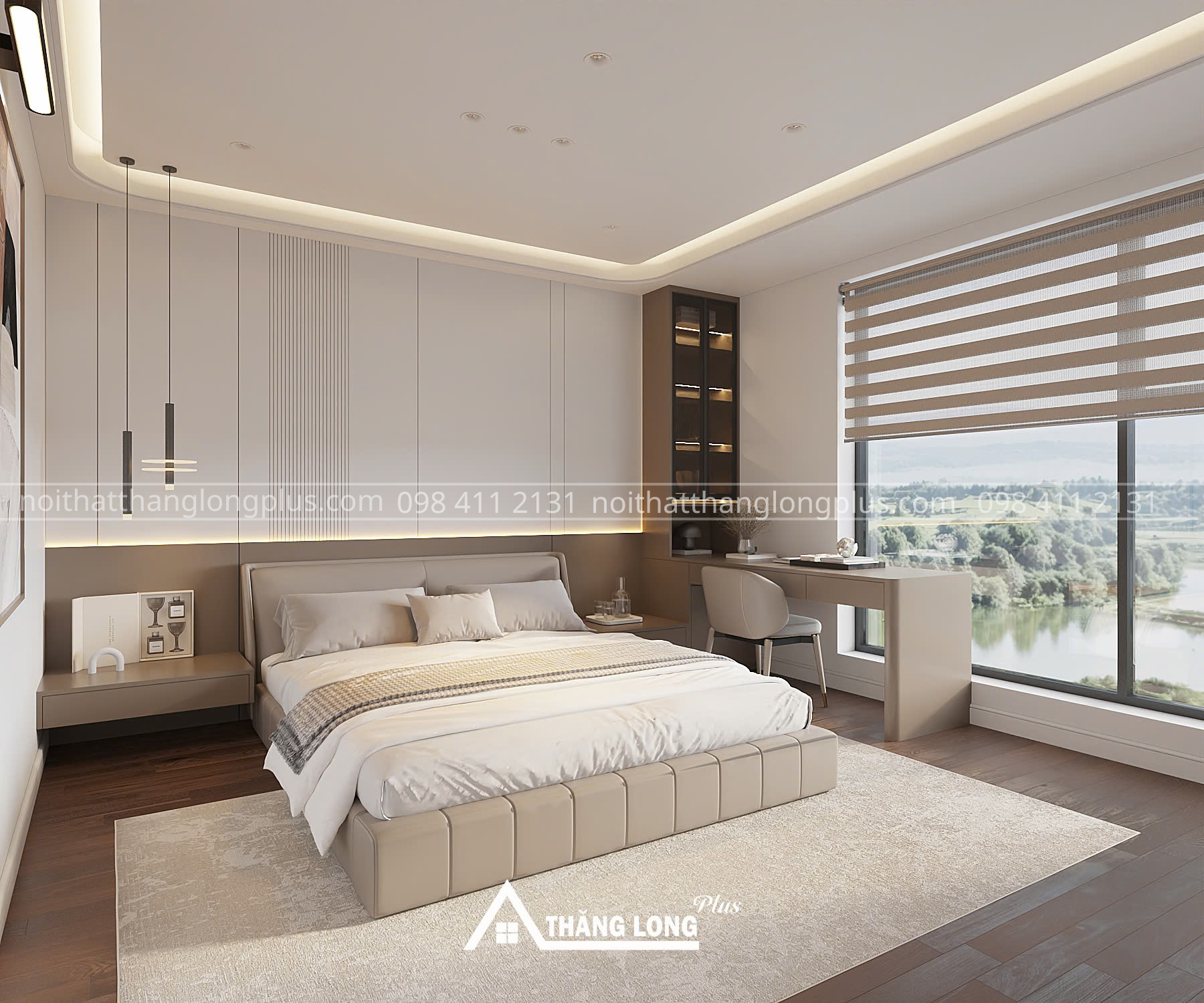 Phòng ngủ master được ưu tiên về diện tích và thiết kế, tập trung tạo cảm giác yên tĩnh – ấm cúng – sang trọng. Bảng màu trung tính kết hợp cùng vật liệu gỗ và vải mềm giúp không gian trở nên nhẹ nhàng, dễ chịu. Nội thất được bố trí tối giản với giường ngủ, hệ tủ quần áo và tab đầu giường thiết kế liền mạch, vừa đảm bảo thẩm mỹ vừa tối ưu công năng sử dụng.